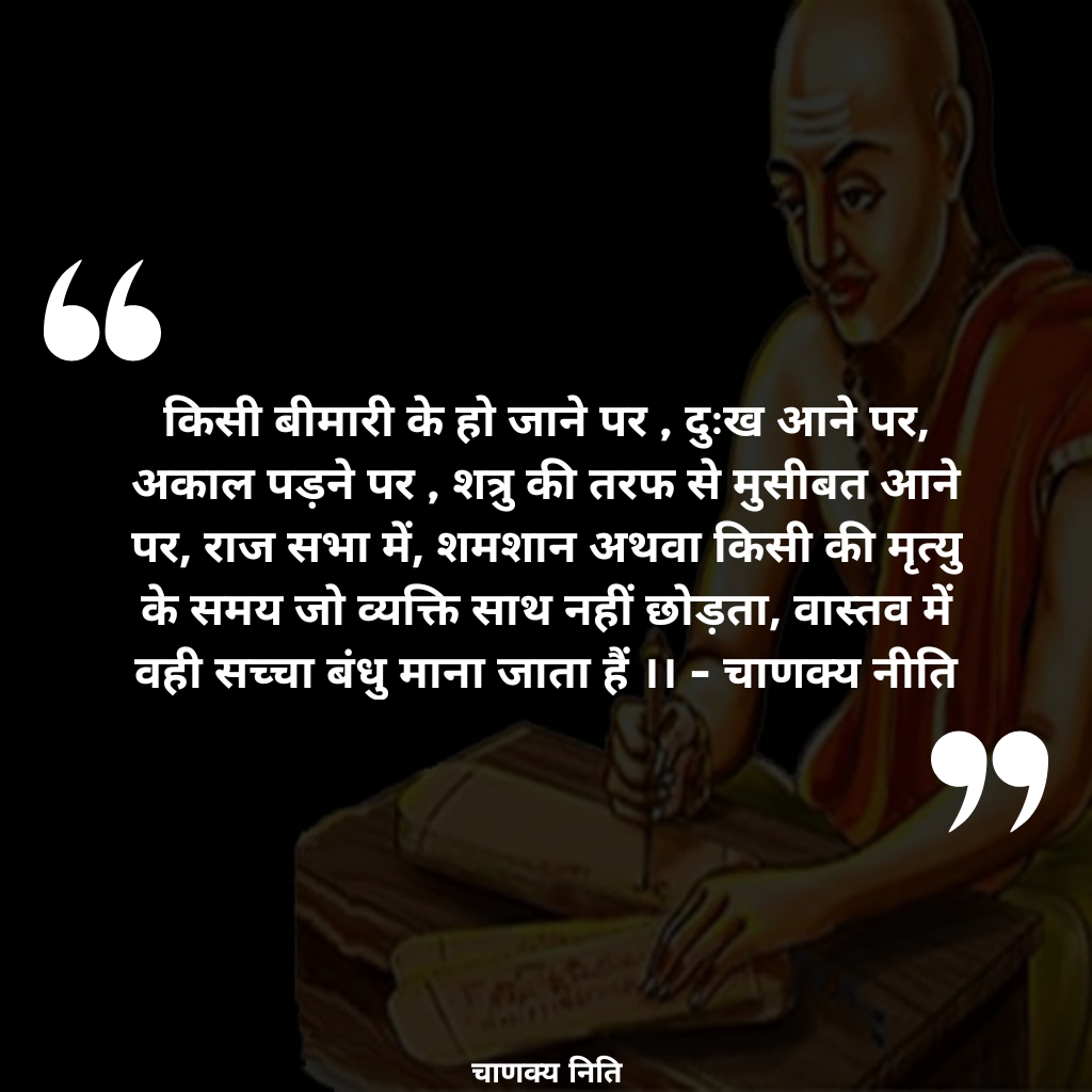 किसी बीमारी के हो जाने पर , दुःख आने पर, अकाल पड़ने पर , शत्रु की तरफ से मुसीबत आने पर, राज सभा में, शमशान अथवा किसी की मृत्यु के समय जो व्यक्ति साथ नहीं छोड़ता, वास्तव में वही सच्चा बंधु माना जाता हैं ।। - चाणक्य नीति